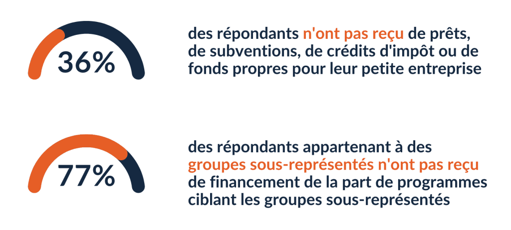 De nombreux participants au sondage, en particulier ceux qui appartiennent à des groupes sous-représentés, ne bénéficient pas des opportunités de financement ciblées sur leur démographie d’entreprise. Cela est probablement lié au fait que les propriétaires d’entreprises ne sont pas conscients de l’existence de financements pertinents pour leur entreprise, ou ne savent pas comment naviguer dans le paysage du financement pour trouver et demander ces programmes.
